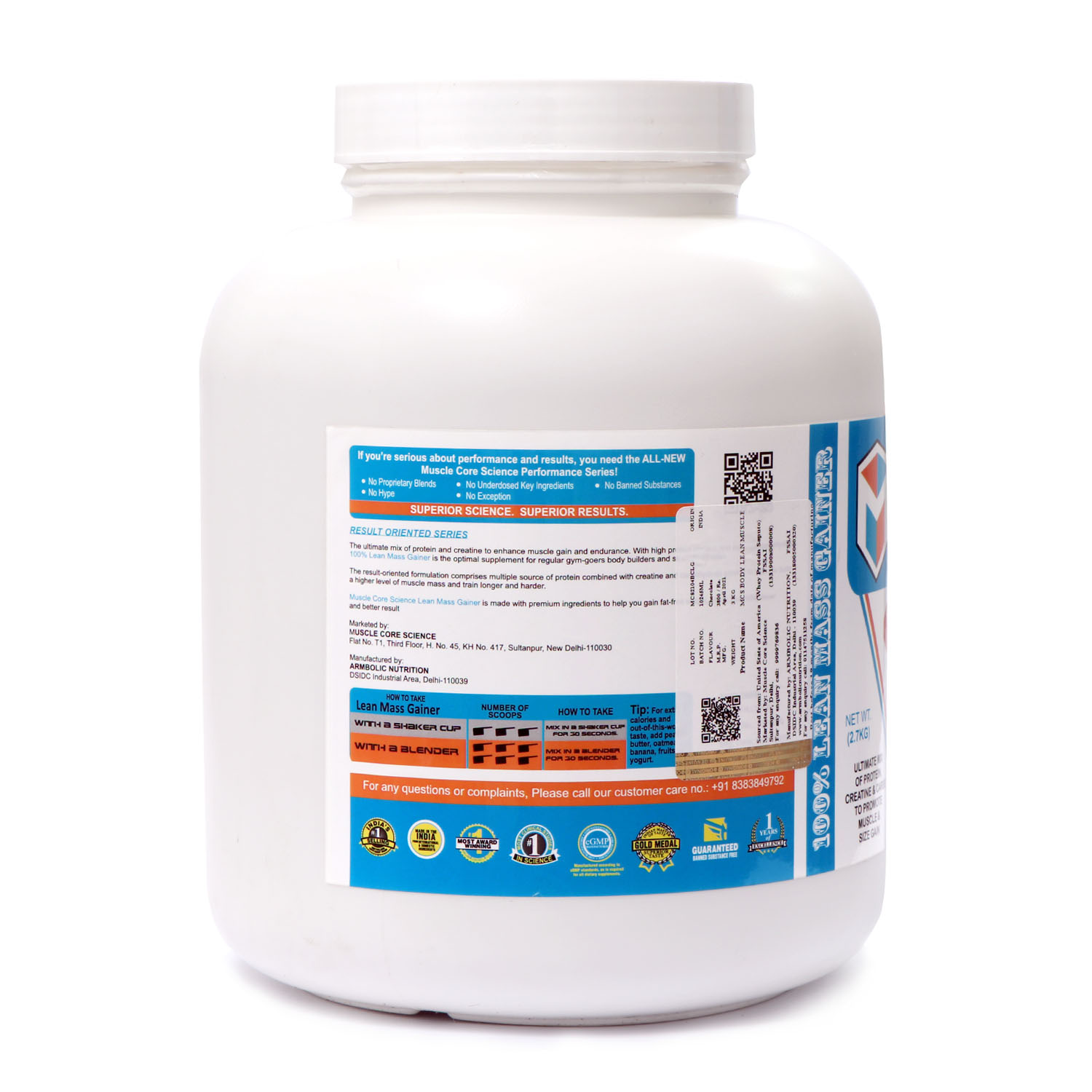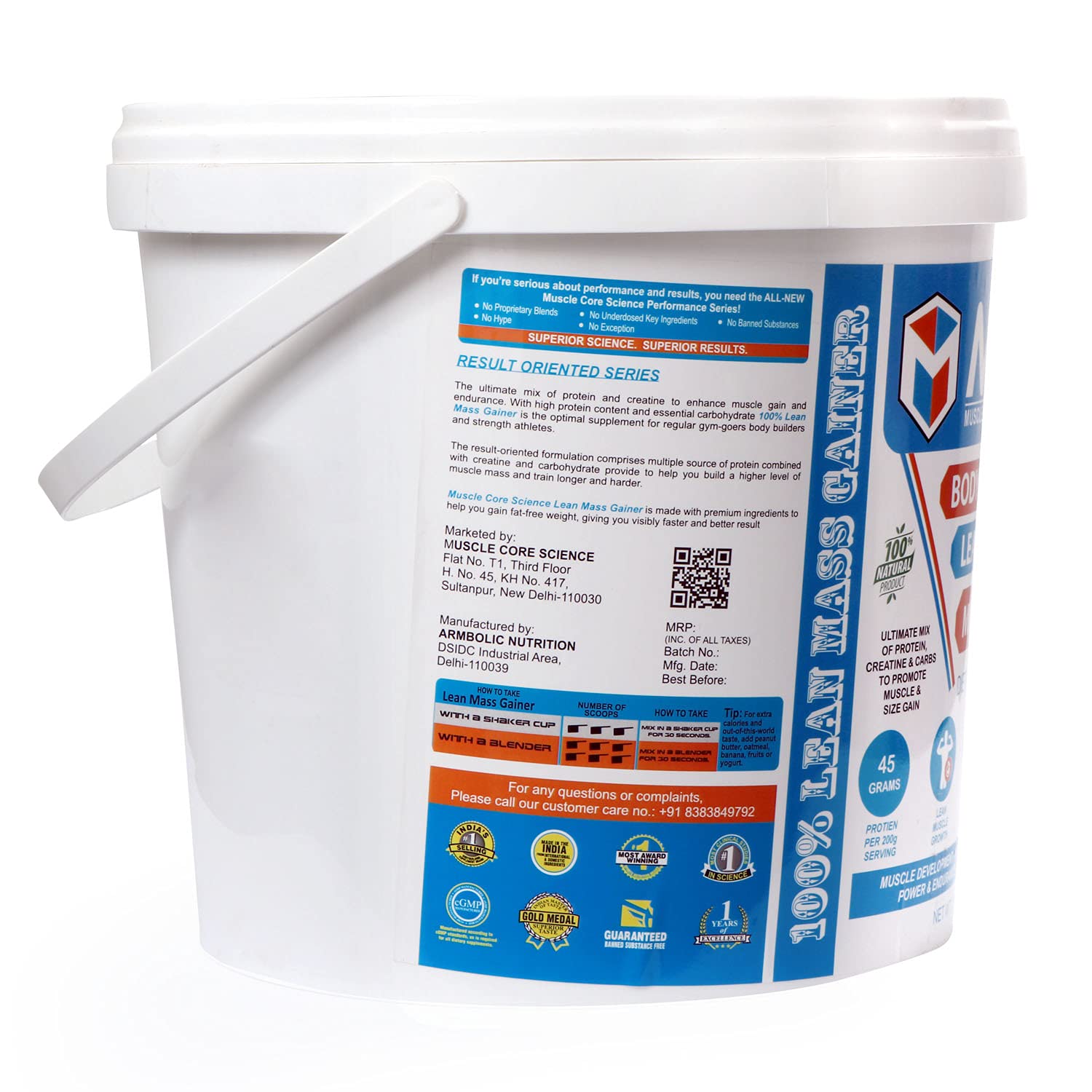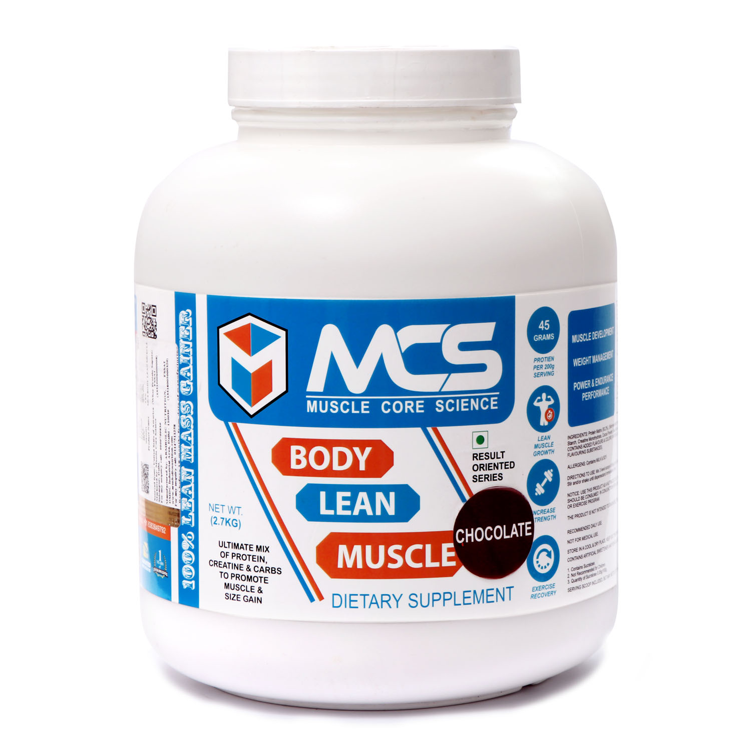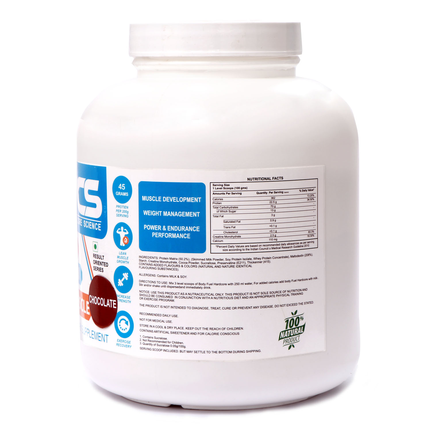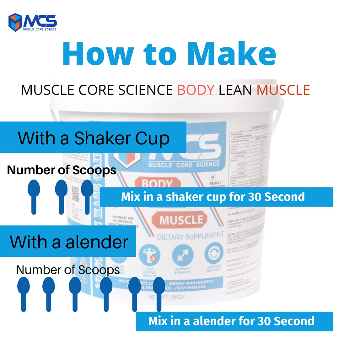 Muscle Core Science Body Lean Muscle is an enhanced formula that helps build lean muscle. A protein-rich supplement with a great taste that provides a rapid increase in strength. It is an ideal supplement, which helps in providing rapid muscle recovery and repair after every workout. Contains the right mix of Malt Dextrin, Soy Protein Isolate, Skim Milk Powder, Starch, Whey Protein Concentrate (80%), Whole Milk Powder, Creatine Monohydrate, Cocoa Powder, Added Flavor (Natural Flavoring Substance), Sucralose, Calcium Phosphate . and sodium benzoate as a preservative.