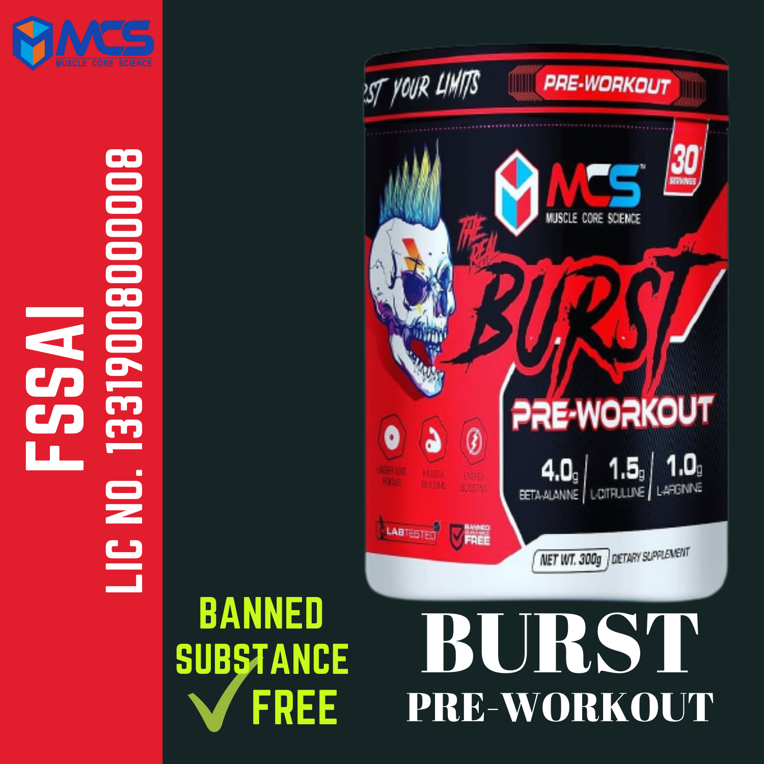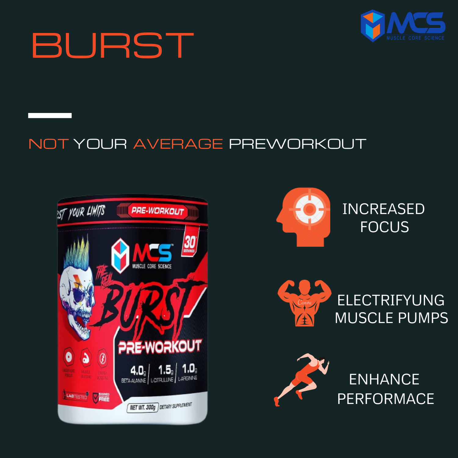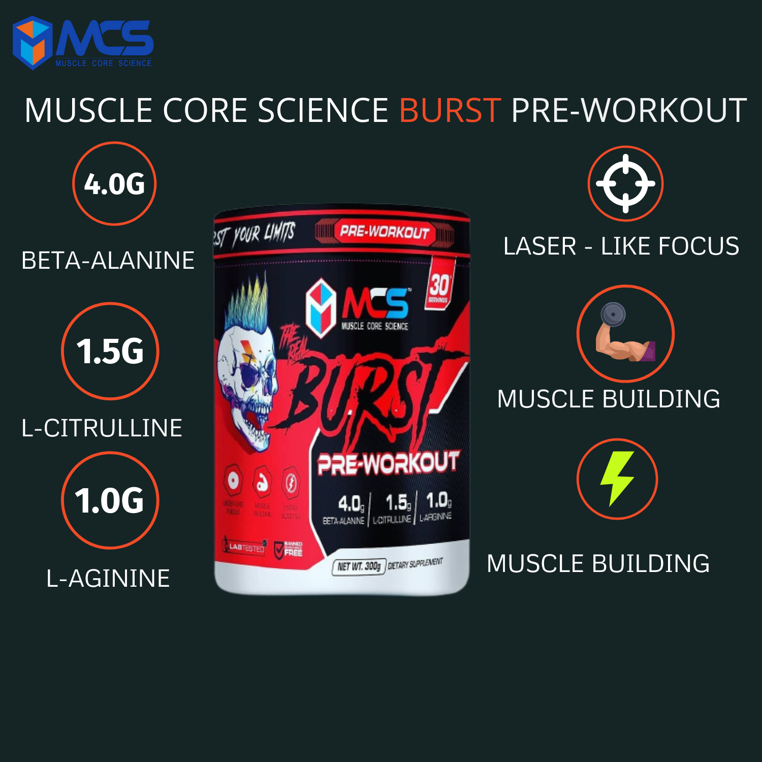 - EXPLOSIVE ENERGY: MCS Burst pre-workout gives you unparalleled energy to fuel your workouts to reach the next level without any chance of crashing