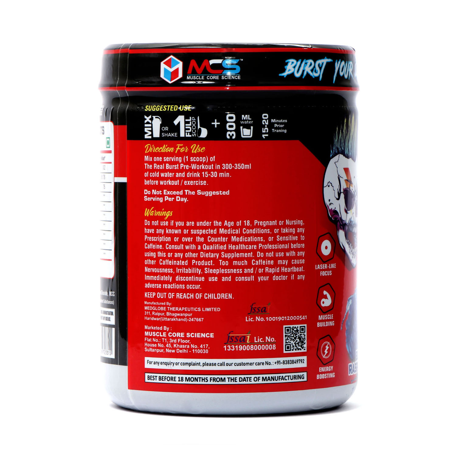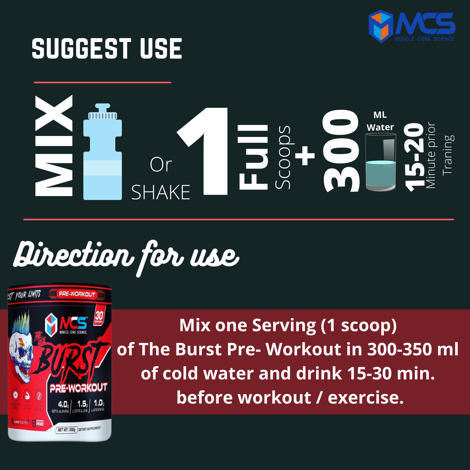 MUSCLE CORE SCIENCE Burst Pre-Workout: Designed to elevate your energy, focus, power output, and performance levels, it will help you get through every workout and prepare you for harder, heavier and longer lifts productive. With so many ingredients dedicated to improving your results, MCS Burst Pre-workout is one of a kind. Stop leaving wins on the table. Start getting the most out of your workouts today with The MCS BURST Pre-workout, the lifting partner you’ve been looking for. Serving Size: For an insane workout – Take a scoop with 150-200ml of water and drink 10-20 minutes before the auction. For intensive training – Take half a scoop with 150-200 ml of water and drink 10-20 minutes before the auction.